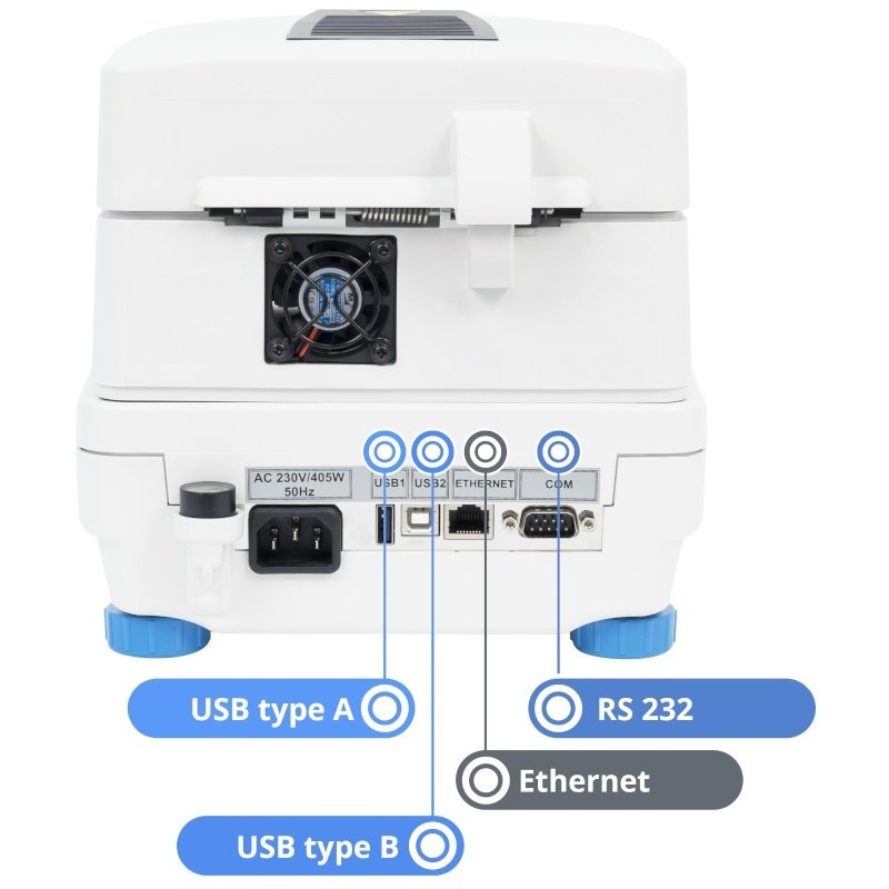 Měření vlhkého vzorku s přesností 0,001 %, komunikační rozhraní 1×RS 232, USB-A, USB-B, Ethernet a WiFi, standardní maximální sušicí teplota je 160°C (za příplatek 1 000 Kč bez DPH lze navýšit na max. 250°C - verze WH).