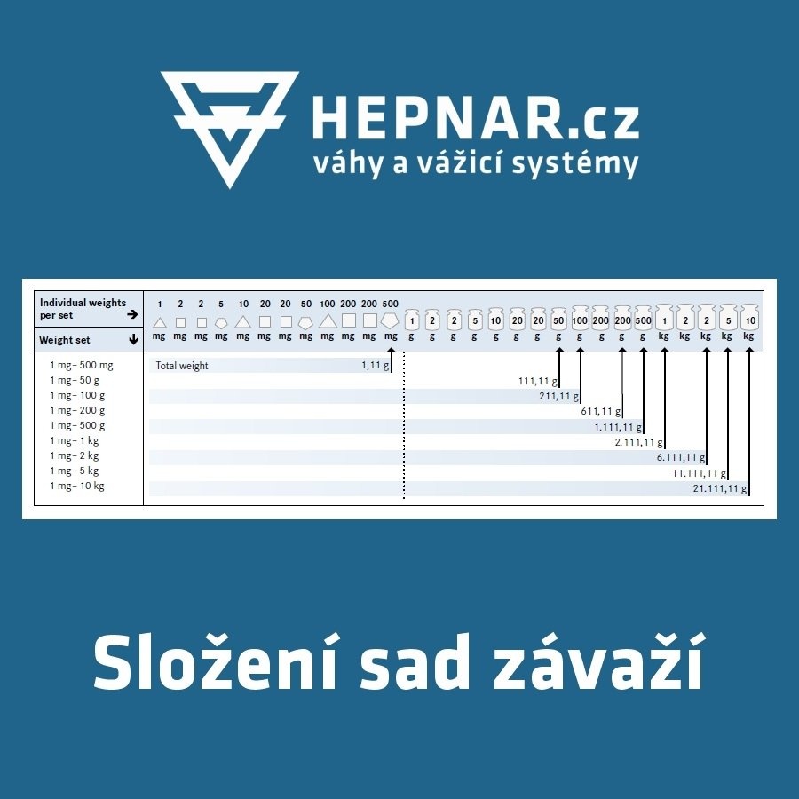 Sadu závaží je možné objednat samostatně nebo s kalibračním listem akreditované laboratoře DAkkS, provedení kalibrace je zpoplatněno částkou 4 675 Kč bez DPH (obj. kód: 962-316). V případě požadavku na dodávku sady závaží s akreditovanou kalibrací, uveďte do poznámky v další fázi objednávky adresu uživatele závaží, kterou si přejete uvést na kalibrační list - pokud tak neučiníte, budeme za tuto adresu považovat adresu dodací.