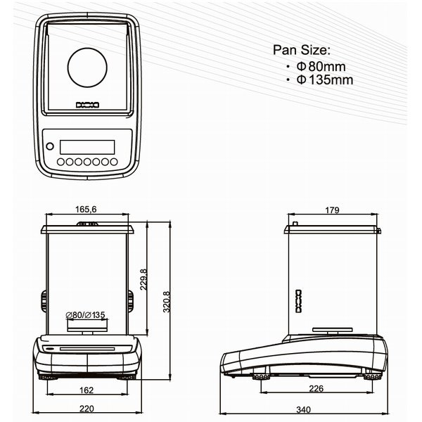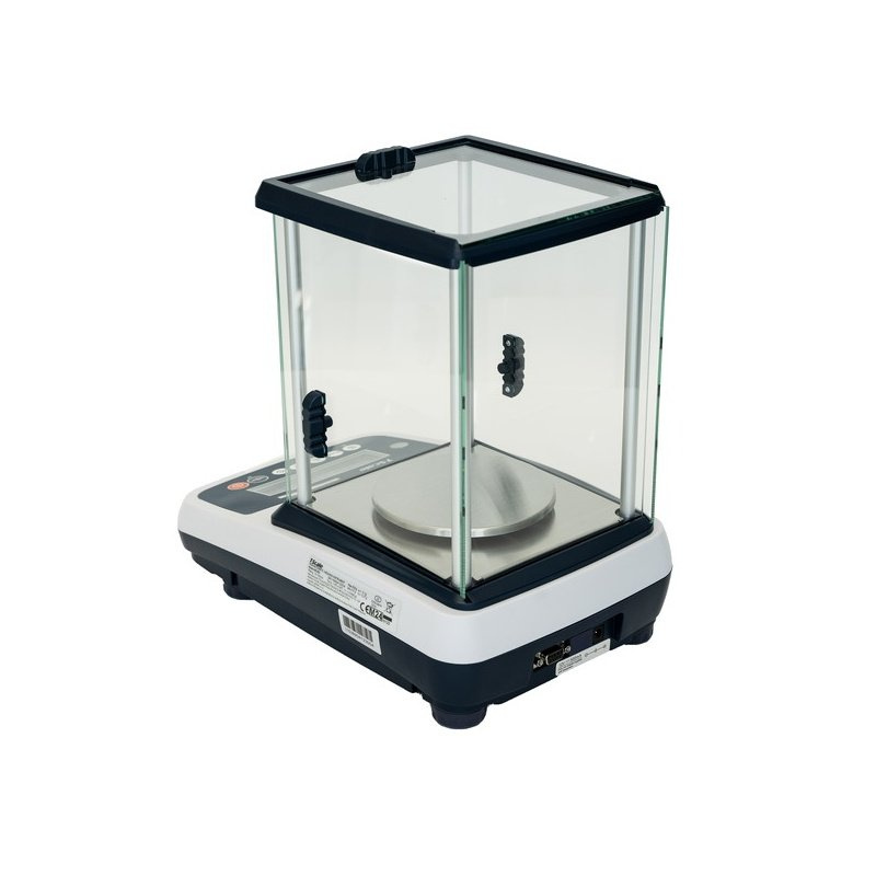 Skleněný protiprůvanový kryt s posuvnými dvířky, rozměry váhy s krytem: 220×340×321 mm, ukazatel kapacity - displej indikuje kolik zbývá do max. možného zatížení.